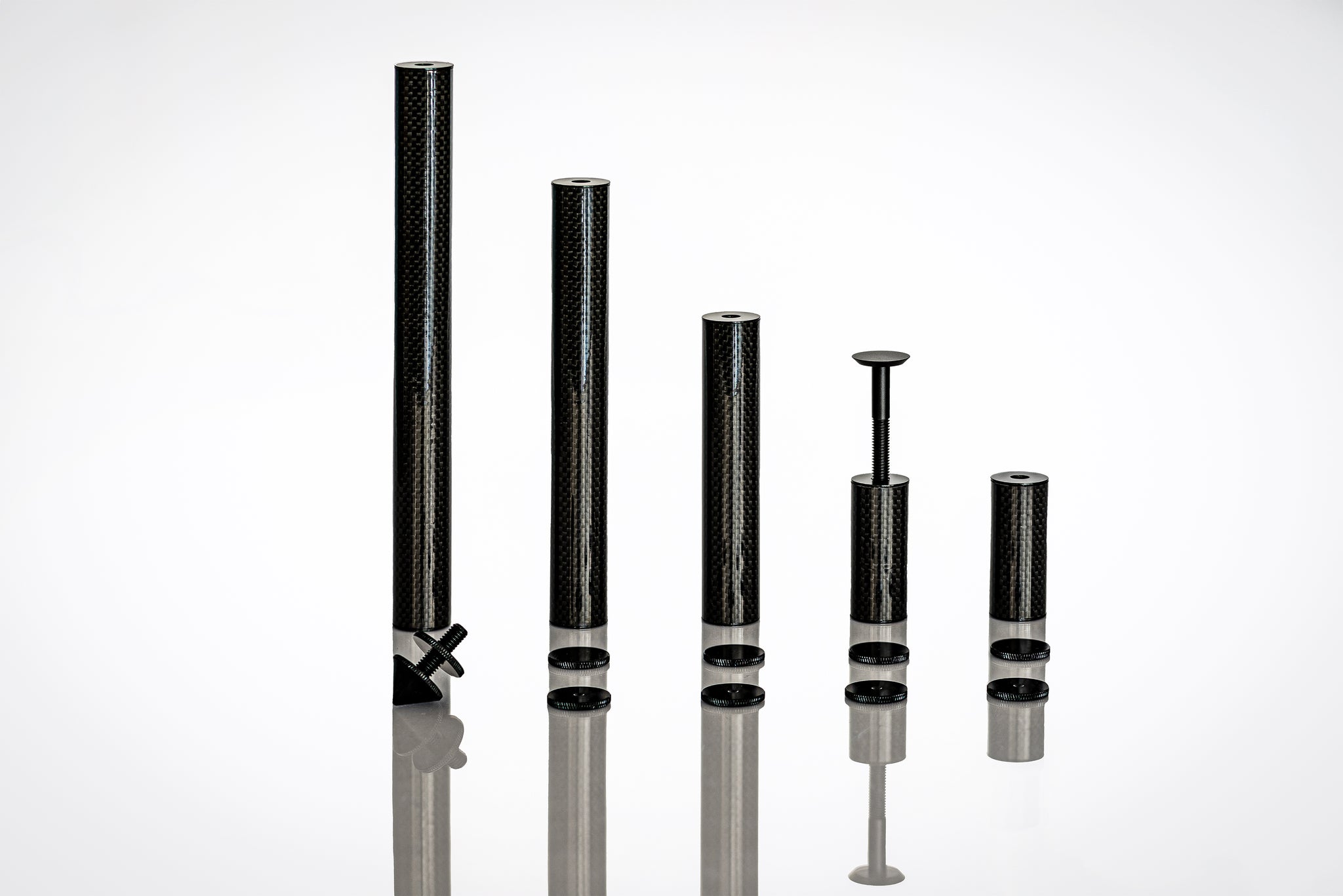 PlenQ only uses carbon (3K cloth) reinforced glass fibre columns. The columns are interconnected with a threaded rod in a custom-made, anchored aluminium part inside the column. No visible screws, bolts, springs, washers, or nuts anywhere on PlenQ’s hi-fi furniture. And... everything fits perfectly. The columns have a diameter of 25 mm and are available in 4 heights, 60, 130, 180 and 240 mm. The 60 mm high column is placed under the bottom platform and fitted with an 8 mm spike and lock nut.