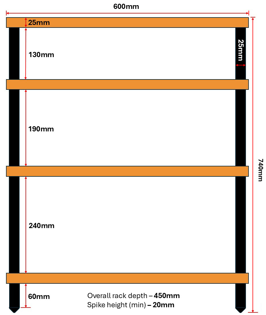 The shelves measure 600 x 450 x 25 mm.