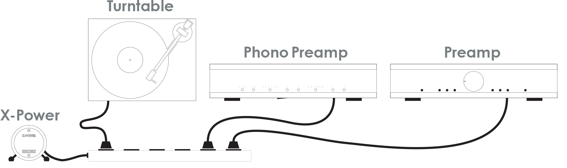 Analogue devices like turntables and phono preamps or preamps (devices that operate with and amplify low voltage signals) should always be kept separate from digital devices. Below example setup consists of turntable, phono preamp and regular preamp.
