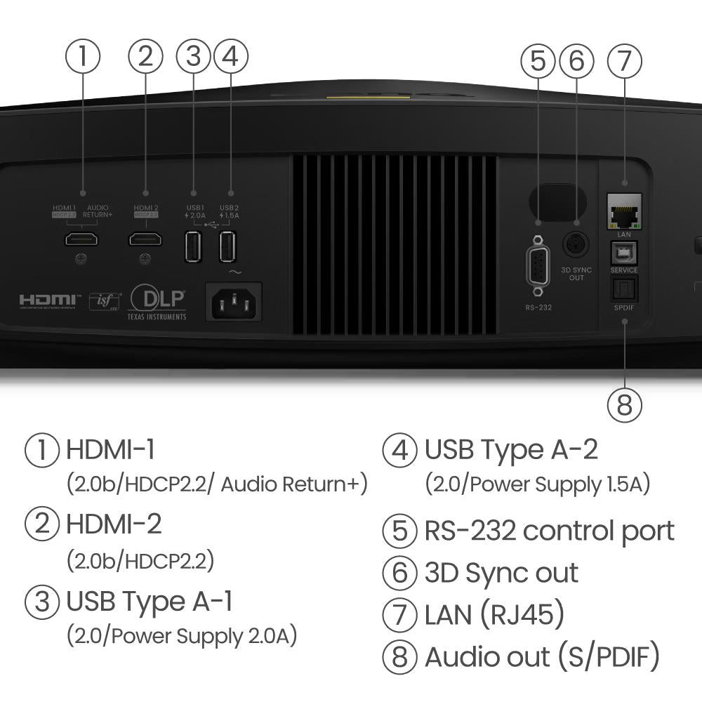 The W5800 connects you to all kinds of entertainment with universal ports including dual HDMI 2.0b (HDCP 2.2)*, two USB-Type A, SPDIF, and eARC allows 7.1 channel and Dolby Atmos audio pass through, transmitting the original-full resolution audio signal to your sound system via one HDMI cable.
