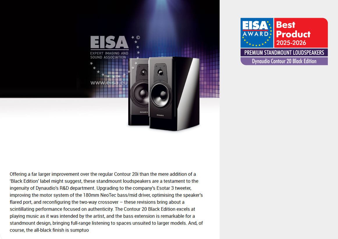 “These standmount loudspeakers are a testament to the ingenuity of Dynaudio’s R&D department… the Contour 20 Black Edition excels at playing music as it was intended by the artist, and the bass extension is remarkable for a standmount design, bringing full-range listening to spaces unsuited to larger models.” – EUROPEAN IMAGING AND SOUND ASSOCIATION, August 2025