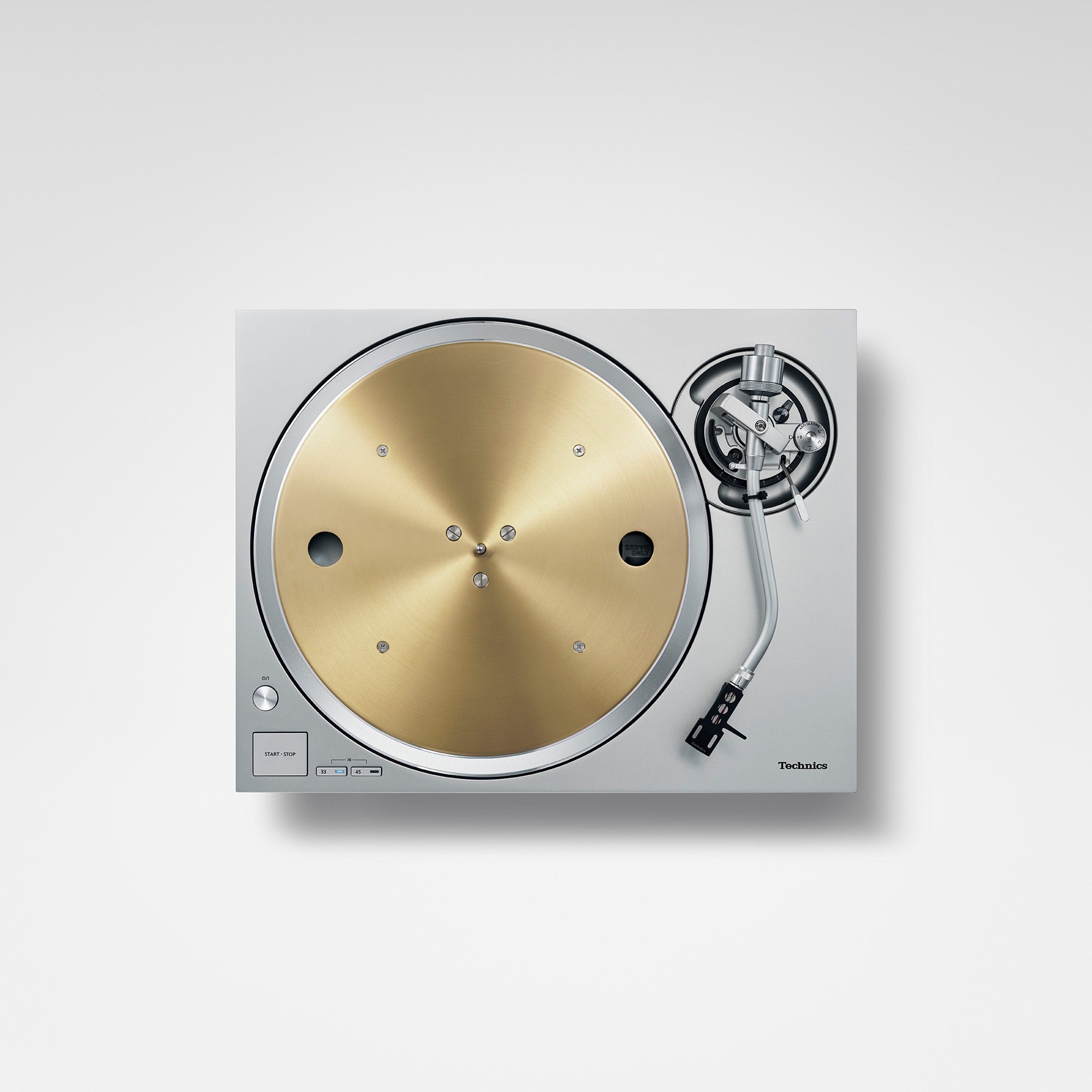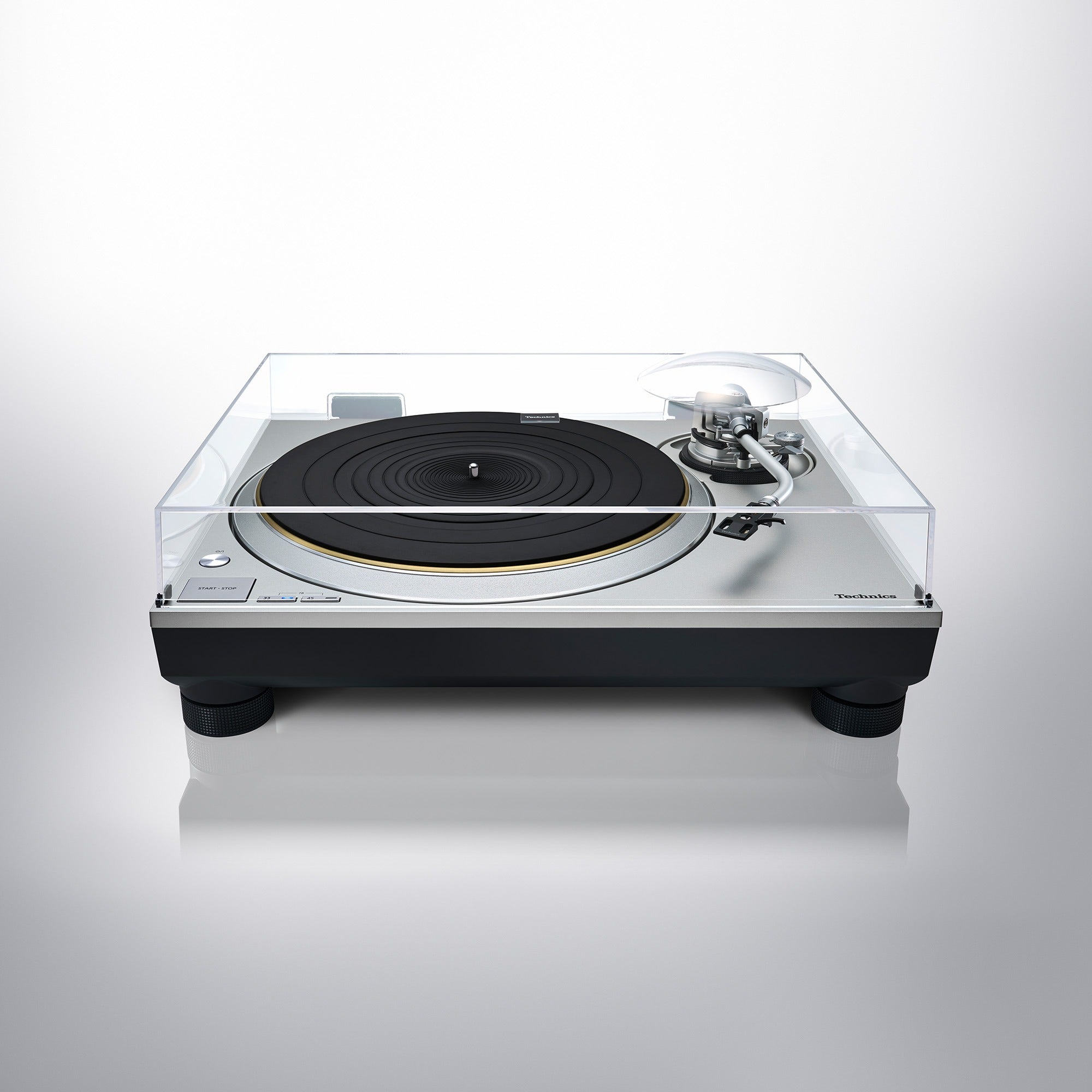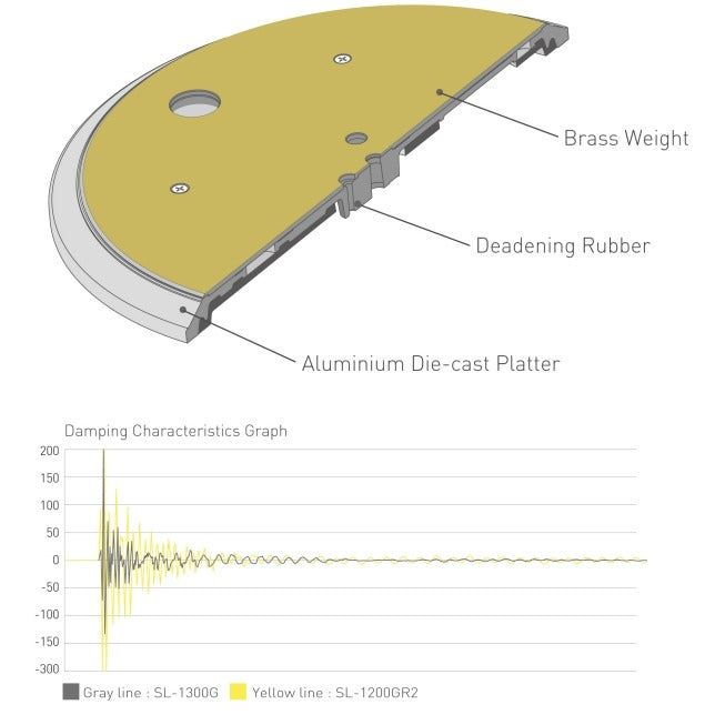 The turntable has a three-layered construction with a rigidly combined brass and aluminium die-cast platter. With a deadening rubber covering its entire rear surface to eliminate unnecessary resonance, thereby achieving high rigidity and vibration damping. This delivers smooth rotational stability and inertial mass surpassing the SP-10MK2, the direct-drive turntable standard used by broadcast stations worldwide, as well as having more than twice the inertial mass of the SL-1200MK5.