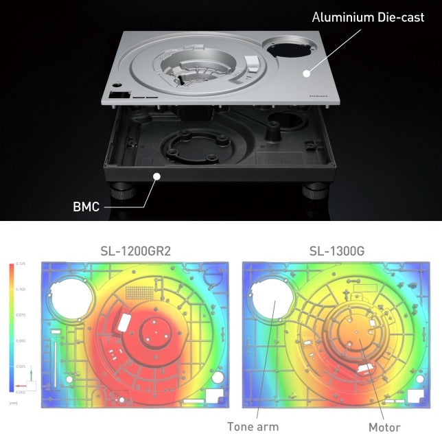 The SL-1300G ensures high rigidity by using a body with a two-layered construction that solidly unifies the BMC and the aluminium die-cast chassis. Reinforcing ribs have been added between the motor/tone arm on the top panel. This improves rigidity and vibration damping characteristics.