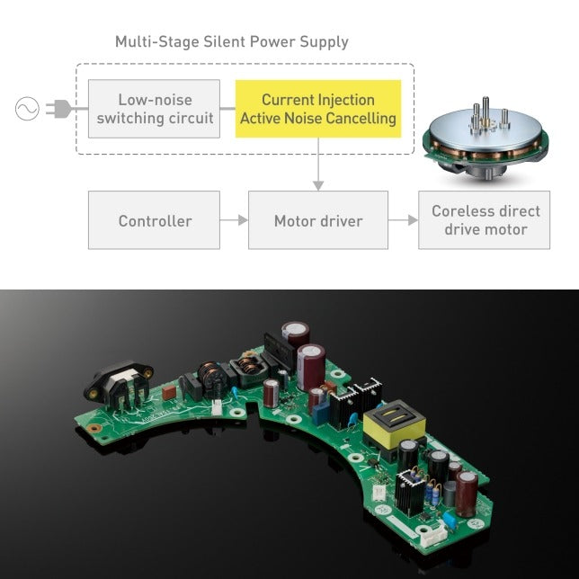 The use of a high-speed switching power supply ensures a stable supply capacity and less ripple and humming. Applying a switching power supply to a turntable eliminates the need for a large transformer and countermeasures for the ensuing mechanical vibrations. A switching frequency of above 100 kHz limits the impact of noise on the music playback bandwidth.