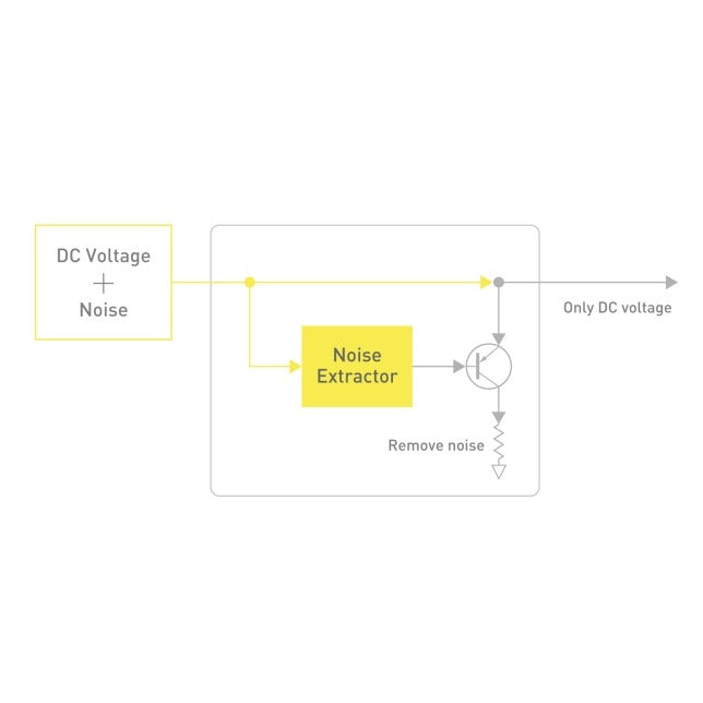 This technology combines a noise detection device with an error amplifier. It detects residual noise in the power supply and applies an inverse phase current to remove noise components. It removes low frequency noise more effectively than a regulator to ensure a more ideal power supply.